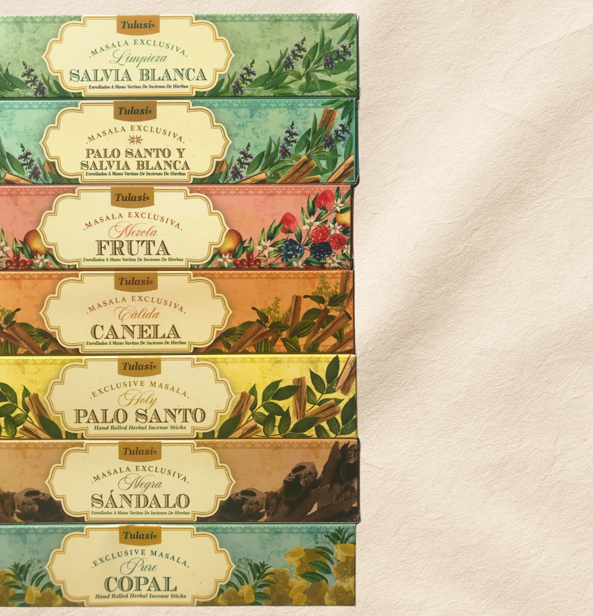 Palo Santo, Sándalo, Palo Santo y Salvia Blanca, Salvia Blanca, Fruta, Canela, Copal