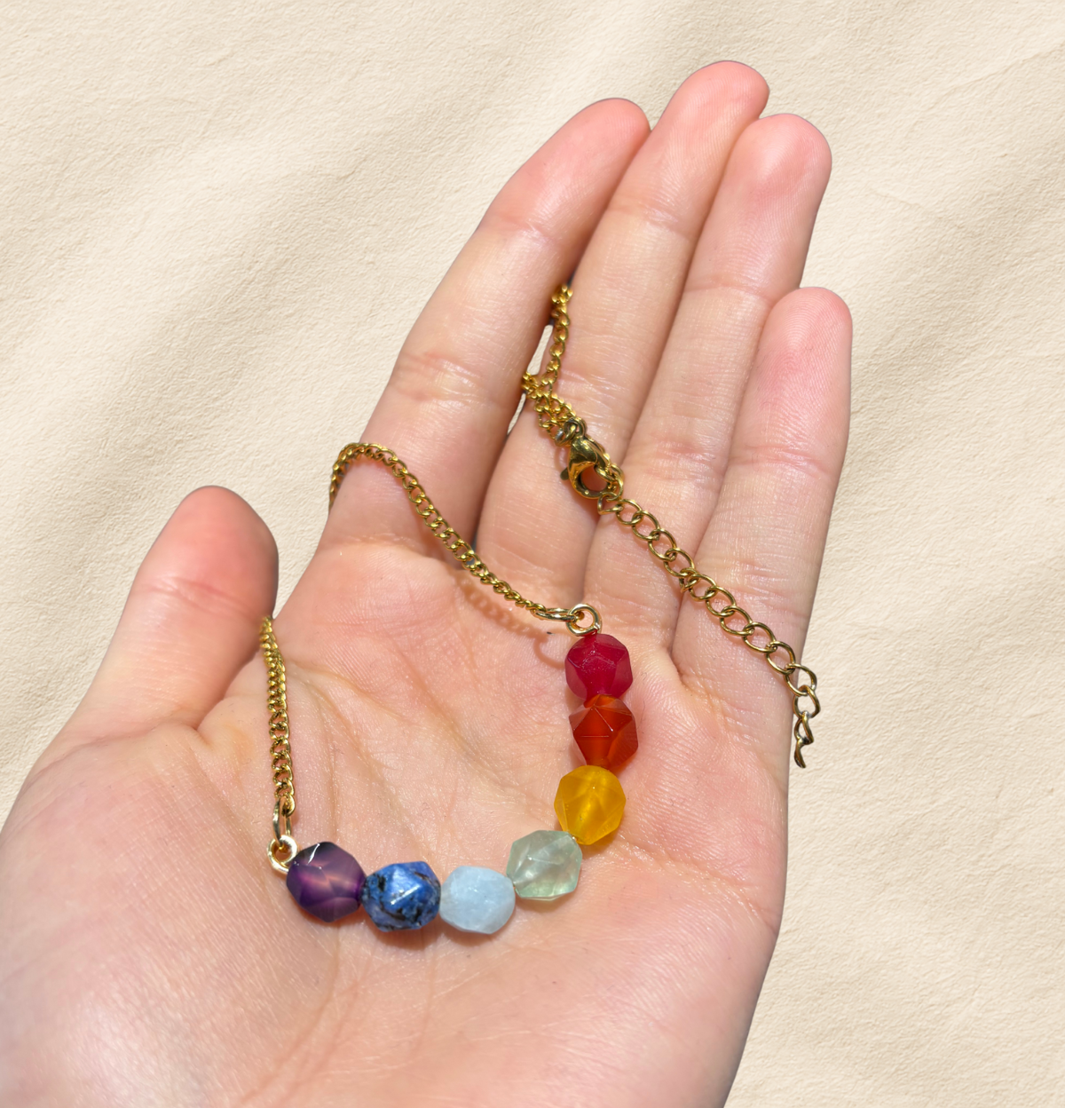 Collares con cuarzos 7 chakras pensados para acompañarte a equilibrar tu energía de forma suave y consciente durante el día. Cada piedra representa un chakra distinto, ayudándote a recordar tu intención: enraizarte, abrir el corazón, expresar tu verdad y conectar con tu intuición.