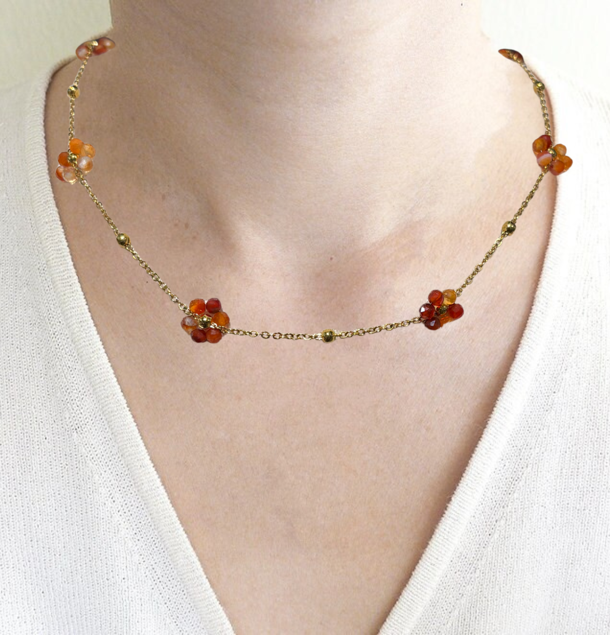 Collar de flores en cuarzo pensado para llevar la energía de la naturaleza siempre contigo, suave, ligera y llena de vida. Cada pétalo en piedra natural se convierte en un pequeño amuleto de amor, alegría y armonía, perfecto para acompañar tus días y darle un toque delicado a cualquier outfit.