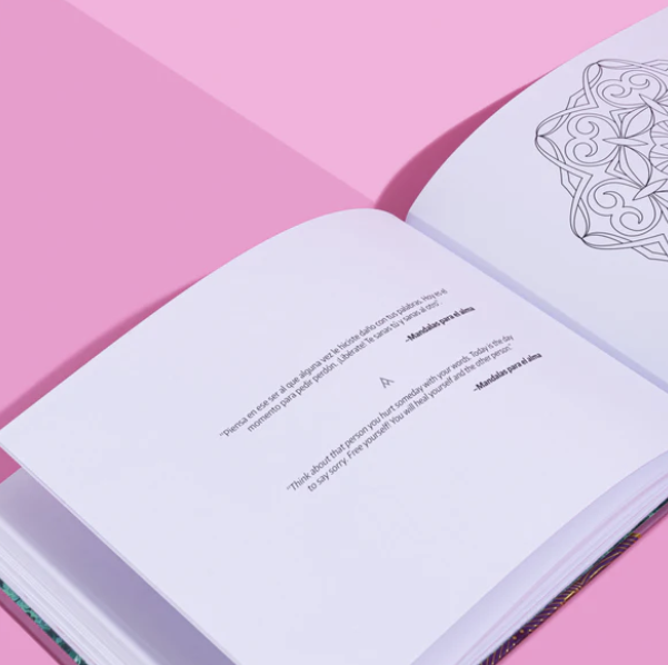 En él encontrarás frases alusivas a la apertura espiritual en inglés y español, así como mandalas más modernos, elaborados y complejos.