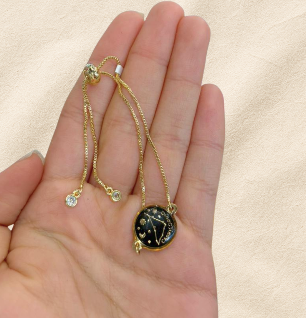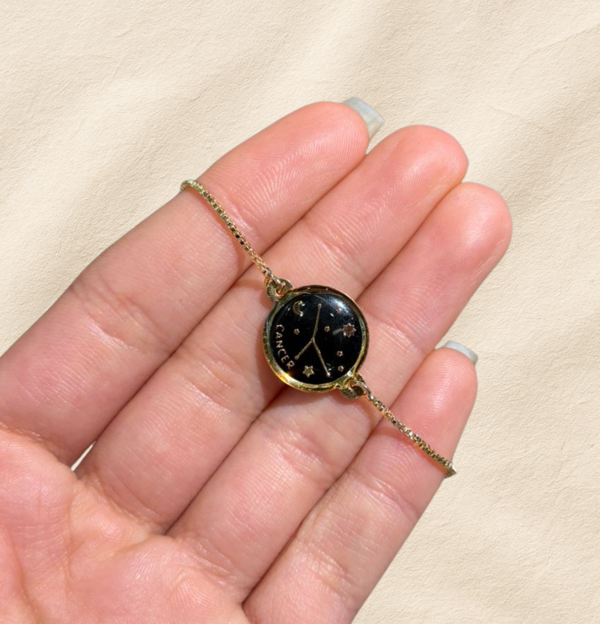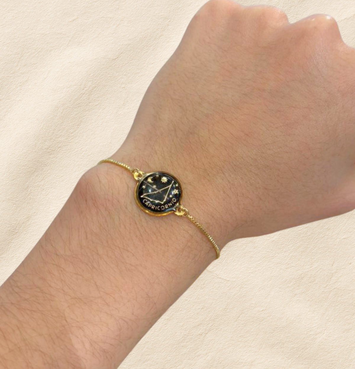 Esta pulsera de constelación es un pequeño universo en tu muñeca. El dije negro enmarcado en dorado resalta la constelación de tu signo junto a lunas y estrellas, acompañándote como un recordatorio suave de tu intuición y tu luz propia. Su diseño delicado se adapta a tu día a día: puedes usarla sola para un toque minimalista o combinarla con otras pulseras para crear tu propio ritual de energía y estilo.