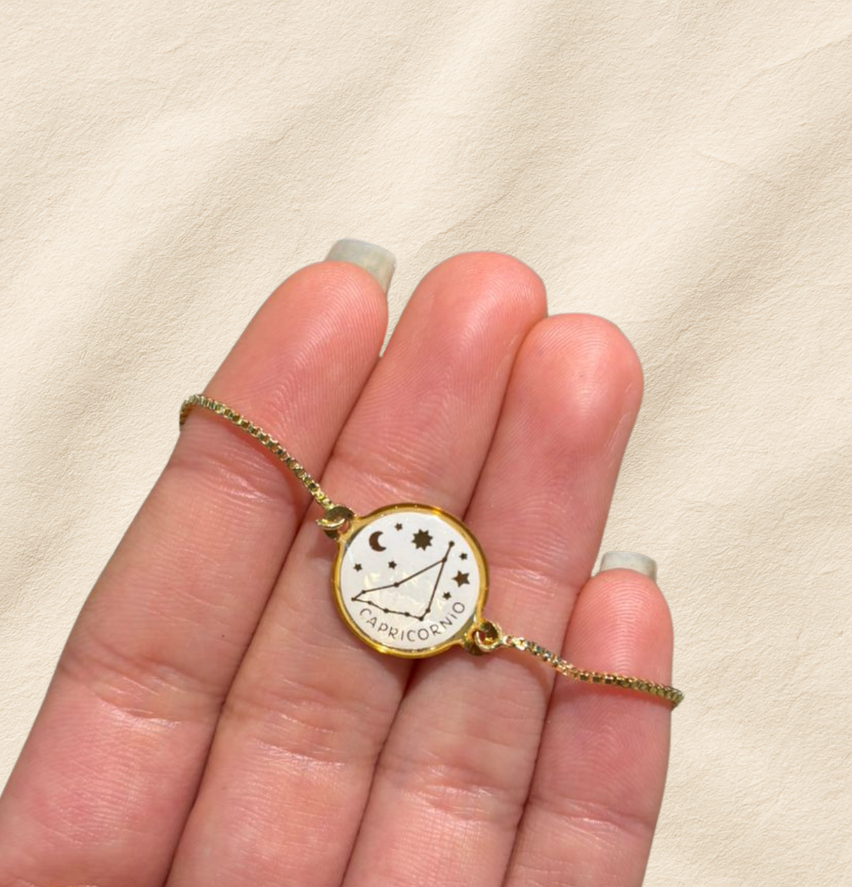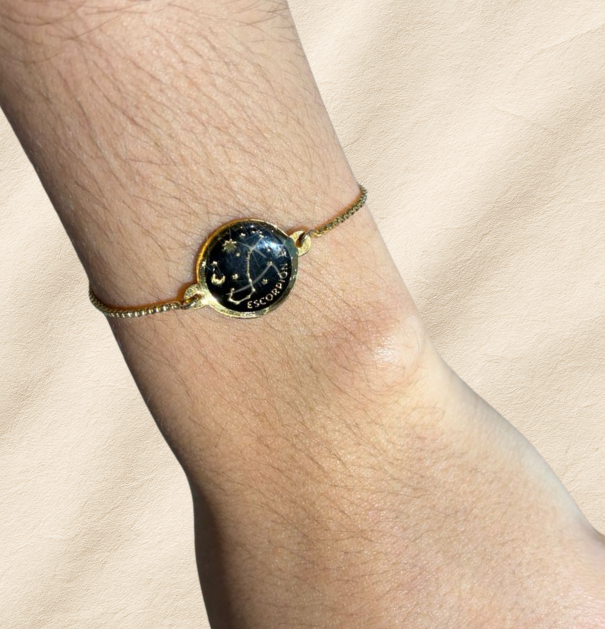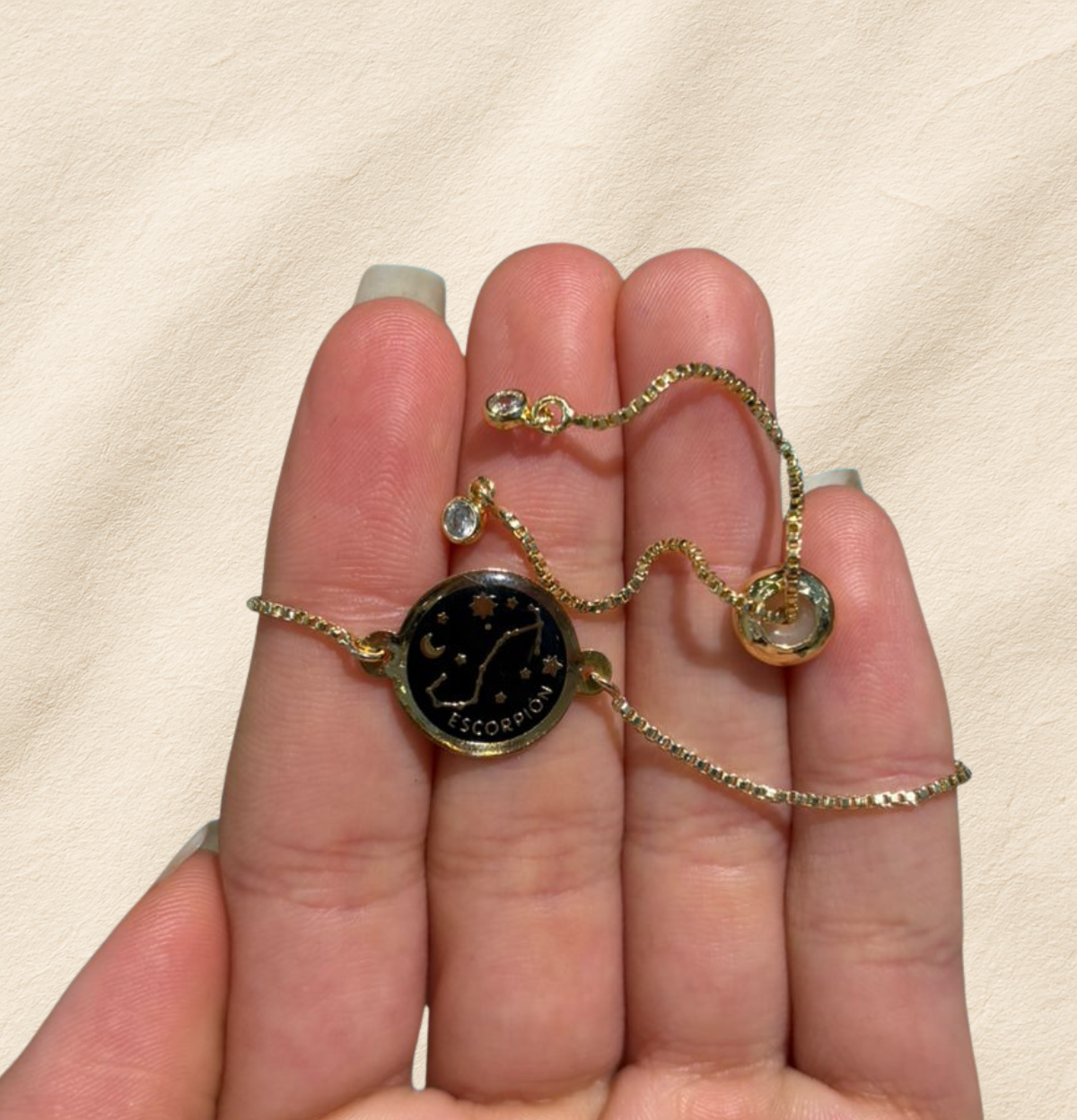 Esta pulsera de constelación es un pequeño universo en tu muñeca. El dije negro enmarcado en dorado resalta la constelación de tu signo junto a lunas y estrellas, acompañándote como un recordatorio suave de tu intuición y tu luz propia. Su diseño delicado se adapta a tu día a día: puedes usarla sola para un toque minimalista o combinarla con otras pulseras para crear tu propio ritual de energía y estilo.