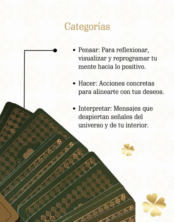 Cada carta es un recordatorio diario de que la suerte no es solo cuestión de azar… también es una actitud y una energía que puedes cultivar. Este oráculo está organizado estratégicamente en tres categorías que te impulsan a tomar el control de tu realidad: