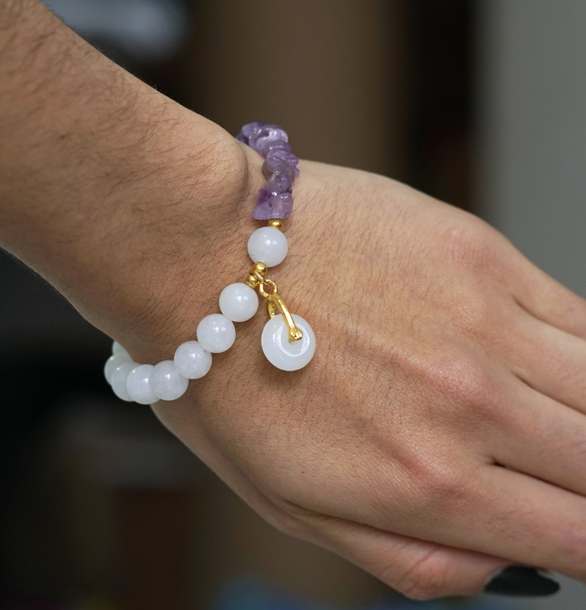 Pulsera de amatista y cuarzo cristal pensada para acompañarte cada día con calma, claridad y protección energética. La amatista ayuda a relajar la mente y conectar con tu intuición, mientras el cuarzo cristal potencia tu intención y actúa como un canal de luz que armoniza todo tu campo energético. 💜🤍✨